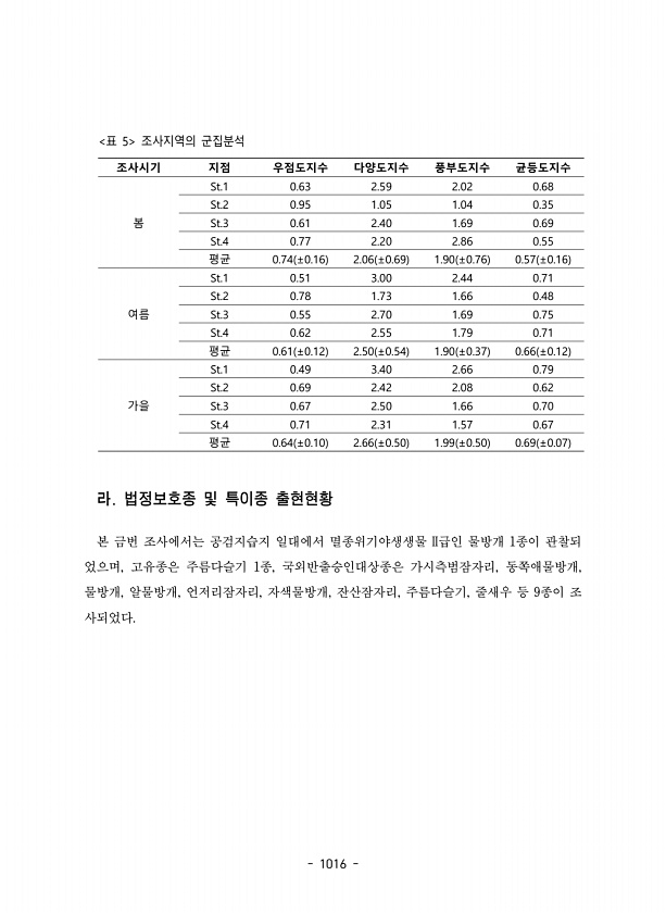 1016 조사시기 지점 우점도지수 다양도지수 풍부도지수 균등도지수 봄 St.1 0.63 2.59 2.02 0.68 St.2 0.95 1.05 1.04 0.35 St.3 0.61 2.40 1.69 0.69 St.4 0.77 2.20 2.86 0.55 평균 0.74 ±0.16 2.06 ±0.69 1.90 ±0.76 0.57 ±0.16 여름 St.1 0.51 3.00 2.44 0.71 St.2 0.78 1.73 1.66 0.48 St.3 0.55 2.70 1.69 0.75 St.4 0.62 2.55 1.79 0.71 평균 0.61 ±0.12 2.50 ±0.54 1.90 ±0.37 0.66 ±0.12 가을 St.1 0.49 3.40 2.66 0.79 St.2 0.69 2.42 2.08 0.62 St.3 0.67 2...