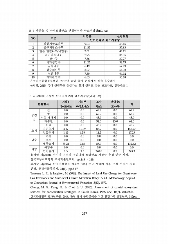 257 NO 수종 낙엽층 산림토양 단위면적당 탄소저장량 1 강원지방소나무 9.03 53.16 2 중부지방소나무 11.85 37.83 3 일본 잎갈나무 낙엽송 7.01 46.71 4 리기다소나무 7.95 36.35 5 잣나무 7.36 37.77 6 기타침엽수 11.25 38.75 7 굴참나무 6.49 57.09 8 상수리나무 5.07 64.30 9 신갈나무 7.30 64.02 10 기타활엽수 6.63 55.68 온실가스종합정보센터. 2015년 승인 국가 온실가스 배출·흡수계수 산림청. 2015. 국내 산림부문 온실가스 통계 신뢰도 상승 보도자료, 첨부자료 1 표 3 낙엽층 및 산림토양탄소 단위면적당 탄소저장량 tC/ha 분류항목 지상부 바이오매스 지하부 바이오매스 토양 탄소 낙엽층/ 고사목 계 농경 지 논 0...