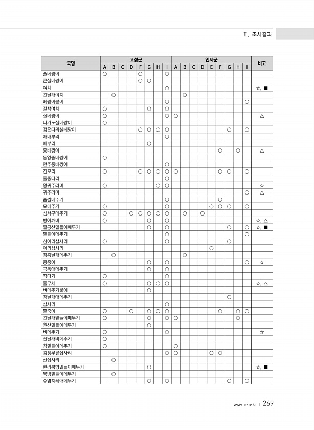 Ⅱ. 조사결과 www.nie.re.kr ? 269 국명 고성군 인제군 비고 A B C D F G H I A B C D E F G H I 줄베짱이 ○ ○ ○ 큰실베짱이 ○ ○ 여치 ○ ☆, ■ 긴날개여치 ○ ○ 베짱이붙이 ○ ○ 갈색여치 ○ ○ ○ 실베짱이 ○ ○ ○ △ 나카노실베짱이 ○ 검은다리실베짱이 ○ ○ ○ ○ ○ ○ 애매부리 ○ 매부리 ○ 중베짱이 ○ ○ △ 동양중베짱이 ○ 만주중베짱이 ○ 긴꼬리 ○ ○ ○ ○ ○ ○ ○ ○ ○ 풀종다리 ○ 왕귀뚜라미 ○ ○ ○ ☆ 귀뚜라미 ○ △ 좁쌀메뚜기 ○ ○ 모메뚜기 ○ ○ ○ ○ ○ ○ 섬서구메뚜기 ○ ○ ○ ○ ○ ○ ○ ○ 방아깨비 ○ ○ ○ ☆, △ 팔공산밑들이메뚜기 ○ ○ ○ ○ ☆, ■ 밑들이메뚜기 ○ ○ 참어리삽사리 ○ ○ ○ 어리삽사리 ○ 참홍날...