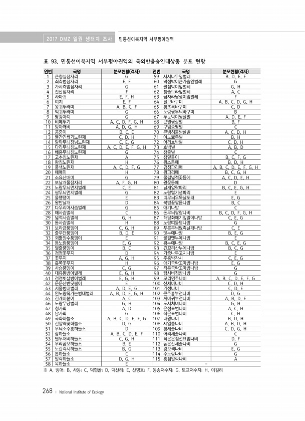 2017 DMZ 일원 생태계 조사 민통선이북지역 서부평야권역 268 ? National Institute of Ecology 연번 국명 분포현황 격자 연번 국명 분포현황 격자 1 큰청실잠자리 G 59 사시나무잎벌레 B, D, E, F 2 쇠측범잠자리 E, F 60 넉점박이큰가슴잎벌레 G 3 가시측범잠자리 G 61 팔점박이잎벌레 G, H 4 잔산잠자리 F 62 청줄보라잎벌레 A, C 5 사마귀 E, F, H 63 금자라남생이잎벌레 F 6 여치 E, F 64 털보바구미 A, B, C, D, G, H 7 왕귀뚜라미 A, B, C, F 65 황초록바구미 C, D 8 먹귀뚜라미 G 66 노랑쌍무늬바구미 B 9 땅강아지 G 67 두눈박이쌍살벌 A, D, E, F 10 벼메뚜기 A, C, D, F, G, H 68 큰별쌍...