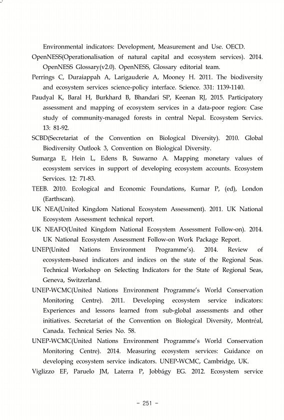 251 Environmental indicatorsDevelopment, Measurement and Use. OECD. OpenNESS Operationalisation of natural capital and ecosystem services 2014. OpenNESS Glossary v2.0 OpenNESS, Glossary editorial team. Perrings C, Duraiappah A, Larigauderie A, Mooney H. 2011. The biodiversity and ecosystem services science-policy interface. Science. 3311139-1140. Paudyal K, Baral H, Burkhard B, Bhandari SP, Keenan...