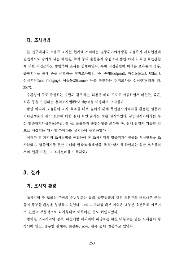 253 본 연구에서의 포유류 조사는 현지에 서식하는 멸종위기야생생물 포유류가 서식현장에 필연적으로 남기게 되는 배설물 족적 등의 출현흔적 수집조사 뿐만 아니라 직접 육안관찰 , 에 의한 직접조사도 병행하여 조사를 진행하였다 특히 직접관찰이 어려운 포유류의 경우 , 출현흔적을 통해 종을 구별하는 현지조사방법 즉 족적 , , footprint , scat , hair , 배설물 털 섭식흔적 food foraging , tunnel 이동통로 등을 확인하는 현지조사를 실시한다 최와 최 , 2007 수환경에 주로 출현하는 수달의 경우에는 하천을 따라 도보로 이동하면서 배설물 족흔 , , , 식흔 등을 수집하는 흔적조사법 Field signs 을 이용하여 조사한다. 뿐만 아니라 포유류의 조사 효과를 더욱 높이기 위해 ...