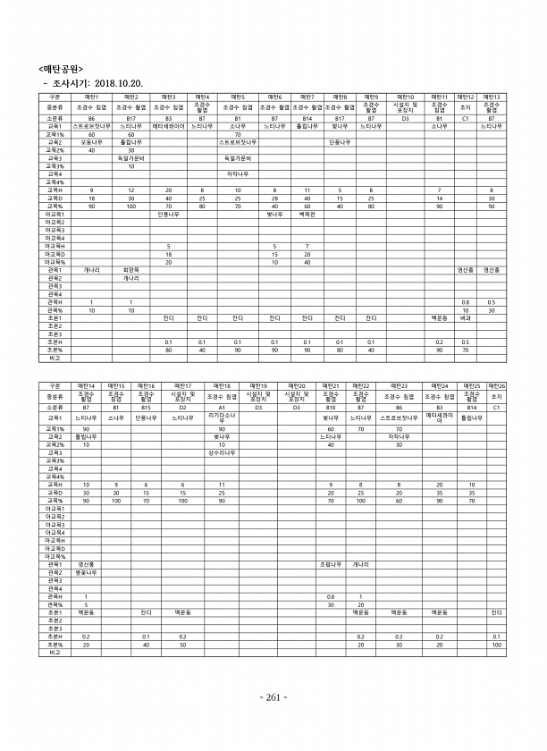 매탄공원 조사시기2018.10.20. 구분 매탄1 매탄2 매탄3 매탄4 매탄5 매탄6 매탄7 매탄8 매탄9 매탄10 매탄11 매탄12 매탄13 중분류 조경수 침엽 조경수 활엽 조경수 침엽 조경수 활엽 조경수 침엽 조경수 활엽 조경수 활엽 조경수 활엽 조경수 활엽 시설지 포장지및 조경수 침엽 초지 조경수 활엽 소분류 B6 B17 B3 B7 B1 B7 B14 B17 B7 D3 B1 C1 B7 교목1 스트로브잣나무 느티나무 메타세콰이어 느티나무 소나무 느티나무 튤립나무 벚나무 느티나무 소나무 느티나무 교목1% 60 60 70 교목2 오동나무 튤립나무 스트로브잣나무 단풍나무 교목2% 40 30 교목3 독일가문비 독일가문비 교목3% 10 교목4 자작나무 교목4% 교목H 9 12 20 8 10 8 11 5 8 7 8 ...