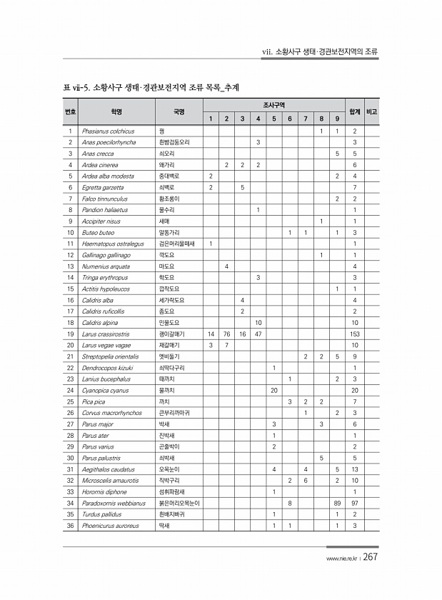 vii. 소황사구 생태·경관보전지역의 조류 www.nie.re.kr ?267 번호 학명 국명 조사구역 합계 비고 1 2 3 4 5 6 7 8 9 1 Phasianus colchicus 꿩 1 1 2 2 Anas poecilorhyncha 흰뺨검둥오리 3 3 3 Anas crecca 쇠오리 5 5 4 Ardea cinerea 왜가리 2 2 2 6 5 Ardea alba modesta 중대백로 2 2 4 6 Egretta garzetta 쇠백로 2 5 7 7 Falco tinnunculus 황조롱이 2 2 8 Pandion haliaetus 물수리 1 1 9 Accipiter nisus 새매 1 1 10 Buteo buteo 말똥가리 1 1 1 3 11 Haematopus ostralegus 검은머리물떼새 1 ...
