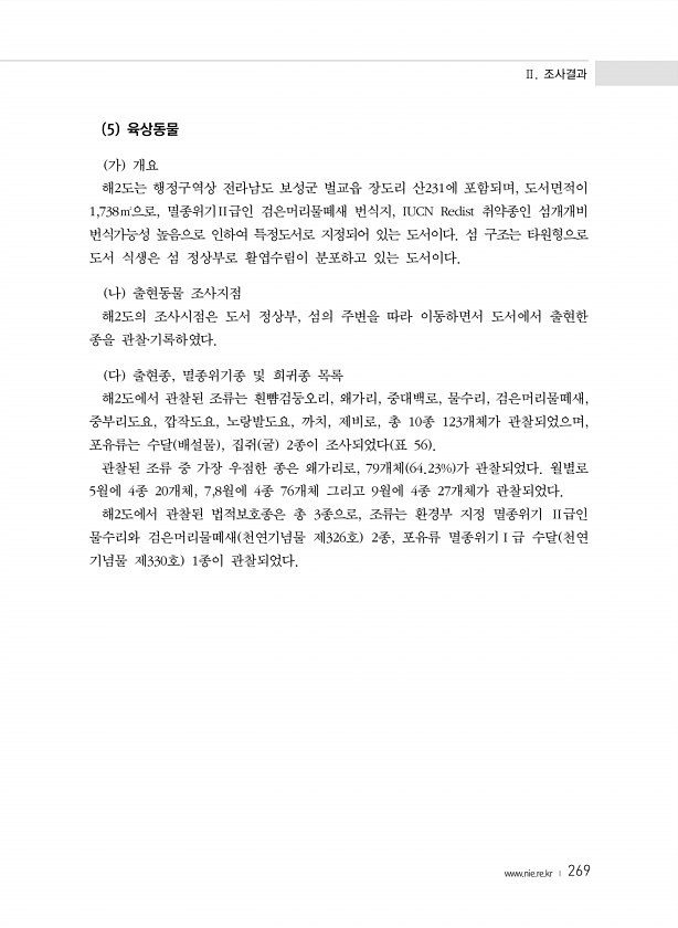 Ⅱ. 조사결과 www.nie.re.kr ? 269 5 육상동물 가 개요 해2도는 행정구역상 전라남도 보성군 벌교읍 장도리 산231에 포함되며, 도서면적이 1,738㎡으로, 멸종위기Ⅱ급인 검은머리물떼새 번식지, IUCN Redist 취약종인 섬개개비 번식가능성 높음으로 인하여 특정도서로 지정되어 있는 도서이다. 섬 구조는 타원형으로 도서 식생은 섬 정상부로 활엽수림이 분포하고 있는 도서이다. 나 출현동물 조사지점 해2도의 조사시점은 도서 정상부, 섬의 주변을 따라 이동하면서 도서에서 출현한 종을 관찰?기록하였다. 다 출현종, 멸종위기종 및 희귀종 목록 해2도에서 관찰된 조류는 흰뺨검둥오리, 왜가리, 중대백로, 물수리, 검은머리물떼새, 중부리도요, 깝작도요, 노랑발도요, 까치, 제비로, 총 10종 123개체가 ...