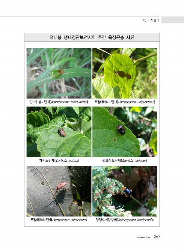 Ⅱ. 조사결과 www.nie.re.kr ? 267 적대봉 생태경관보전지역 주간 육상곤충 사진 긴가위뿔노린재 Acanthosoma labiduroides 두점배허리노린재 Homoeocerus unipunctatus 가시노린재 Carbula putoni 깜보라노린재 Menida violacea 두점배허리노린재 Homoeocerus unipunctatus 검정오이잎벌레 Aulacophora nigripennis