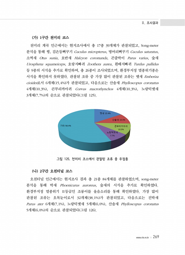 Ⅱ. 조사결과 www.nie.re.kr ? 269 가 1구간 천미리 코스 천미리 계곡 인근에서는 현지조사에서 총 17종 39개체가 관찰되었고, Song-meter 분석을 통해 꿩, 검은등뻐꾸기 Cuculus micropterus, 벙어리뻐꾸기 Cuculus saturatus, 소쩍새 Otus sunia, 호반새 Halcyon coromanda, 곤줄박이 Parus varius, 숲새 Urosphena squameiceps, 호랑지빠귀 Zoothera aurea, 흰배지빠귀 Turdus pallidus 등 9종의 서식을 추가로 확인하여, 총 26종이 조사되었으며, 환경부지정 멸종위기종은 서식을 확인하지 못하였다. 관찰된 조류 중 가장 많이 관찰된 조류는 멧새 Emberiza cioides로서 6개체 15.4%...