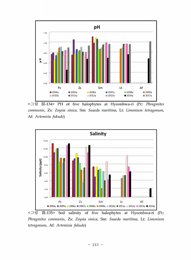 243 그림 Ⅲ-134 PH of five halophytes at Hyeonhwa-ri PcPhragmites communis, ZsZoysia sinica, SmSuaeda maritima, LtLimonium tetragonum, AfArtemisia fukudo 그림 Ⅲ-135 Soil salinity of five halophytes at Hyeonhwa-ri PcPhragmites communis, ZsZoysia sinica, SmSuaeda maritima, LtLimonium tetragonum, AfArtemisia fukudo