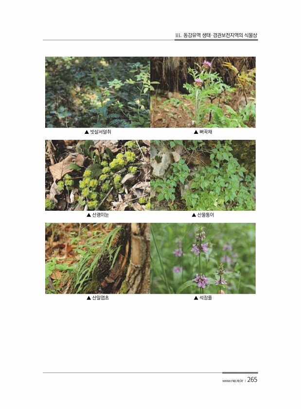 iii. 동강유역 생태·경관보전지역의 식물상 www.nie.re.kr ?265 ▲ 빗살서덜취 ▲ 뻐꾹채 ▲ 산괭이눈 ▲ 산물통이 ▲ 산일엽초 ▲석잠풀