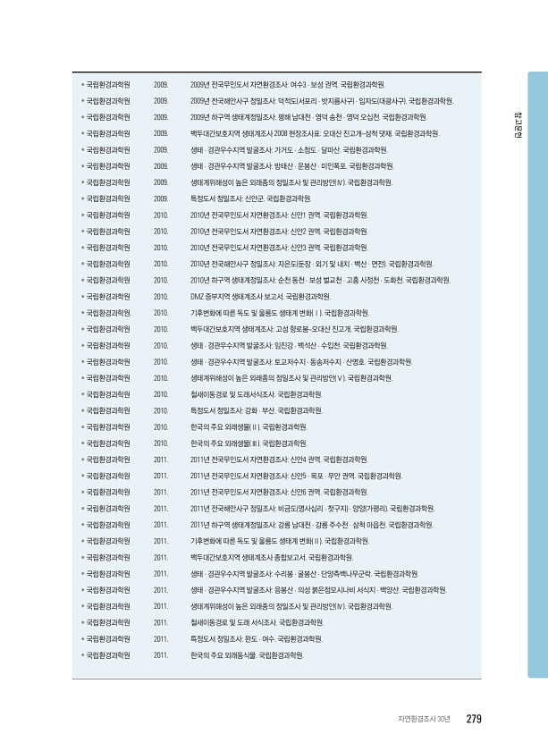 ? 국립환경과학원 2009. 2009년 전국무인도서 자연환경조사여수3 · 보성 권역. 국립환경과학원. ? 국립환경과학원 2009. 2009년 전국해안사구 정밀조사덕적도 서포리 · 밧지름사구 · 임자도 대광사구 국립환경과학원. ? 국립환경과학원 2009. 2009년 하구역 생태계정밀조사평해 남대천 · 영덕 송천 · 영덕 오십천. 국립환경과학원. ? 국립환경과학원 2009. 백두대간보호지역 생태계조사 2008 현장조사표오대산 진고개삼척 댓재. 국립환경과학원. ? 국립환경과학원 2009. 생태 · 경관우수지역 발굴조사가거도 · 소청도 · 달마산. 국립환경과학원. ? 국립환경과학원 2009. 생태 · 경관우수지역 발굴조사방태산 · 운봉산 · 미인폭포. 국립환경과학원. ? 국립환경과학원 2009. 생태계위해성이 높은...