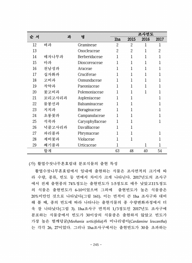 순 서 과 명 조사연도 1ha 2015 2016 2017 12 벼과 Gramineae 2 2 1 1 13 Onocleaceae 2 2 1 2 14 매자나무과 Berberidaceae 1 1 1 1 15 마과 Dioscoreaceae 1 1 1 1 16 천남성과 Araceae 1 1 1 1 17 십자화과 Cruciferae 1 1 1 1 18 고비과 Osmundaceae 1 1 1 1 19 작약과 Paeoniaceae 1 1 1 1 20 꽃고비과 Polemoniaceae 1 1 1 1 21 꼬리고사리과 Aspleniaceae 1 1 1 22 물봉선과 Balsaminaceae 1 1 1 23 지치과 Boraginaceae 1 1 1 24 초롱꽃과 Campanulaceae 1 1 1 25 석죽과 Caryophyl...