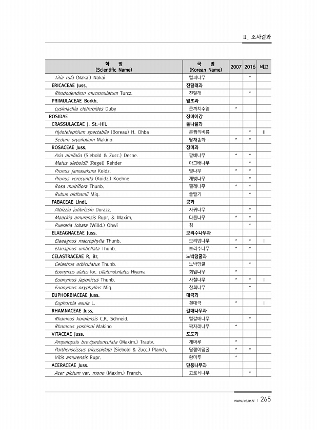 Ⅱ. 조사결과 www.nie.re.kr ? 265 학 명 Scientific Name 국 명 Korean Name 2007 2016 비고 Tilia rufa Nakai Nakai 털피나무 * ERICACEAE Juss. 진달래과 Rhododendron mucronulatum Turcz. 진달래 * PRIMULACEAE Borkh. 앵초과 Lysimachia clethroides Duby 큰까치수염 * ROSIDAE 장미아강 CRASSULACEAE J. St.-Hil. 돌나물과 Hylotelephium spectabile Boreau H. Ohba 큰꿩의비름 * Ⅲ Sedum oryzifolium Makino 땅채송화 * * ROSACEAE Juss. 장미과 Aria alnifolia Siebold & Zuc...