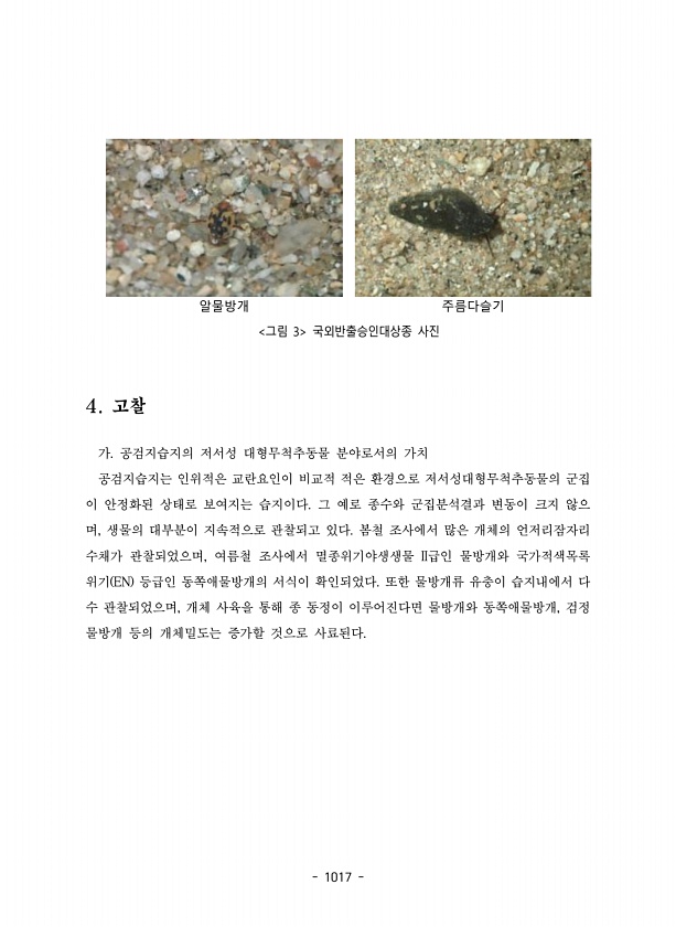 1017 알물방개 주름다슬기 그림 3 국외반출승인대상종 사진 4. 고찰 가. 공검지습지의 저서성 대형무척추동물 분야로서의 가치 공검지습지는 인위적은 교란요인이 비교적 적은 환경으로 저서성대형무척추동물의 군집 이 안정화된 상태로 보여지는 습지이다. 그 예로 종수와 군집분석결과 변동이 크지 않으 며, 생물의 대부분이 지속적으로 관찰되고 있다. 봄철 조사에서 많은 개체의 언저리잠자리 수채가 관찰되었으며, 여름철 조사에서 멸종위기야생생물 II급인 물방개와 국가적색목록 위기 EN 등급인 동쪽애물방개의 서식이 확인되었다. 또한 물방개류 유충이 습지내에서 다 수 관찰되었으며, 개체 사육을 통해 종 동정이 이루어진다면 물방개와 동쪽애물방개, 검정 물방개 등의 개체밀도는 증가할 것으로사료된다.