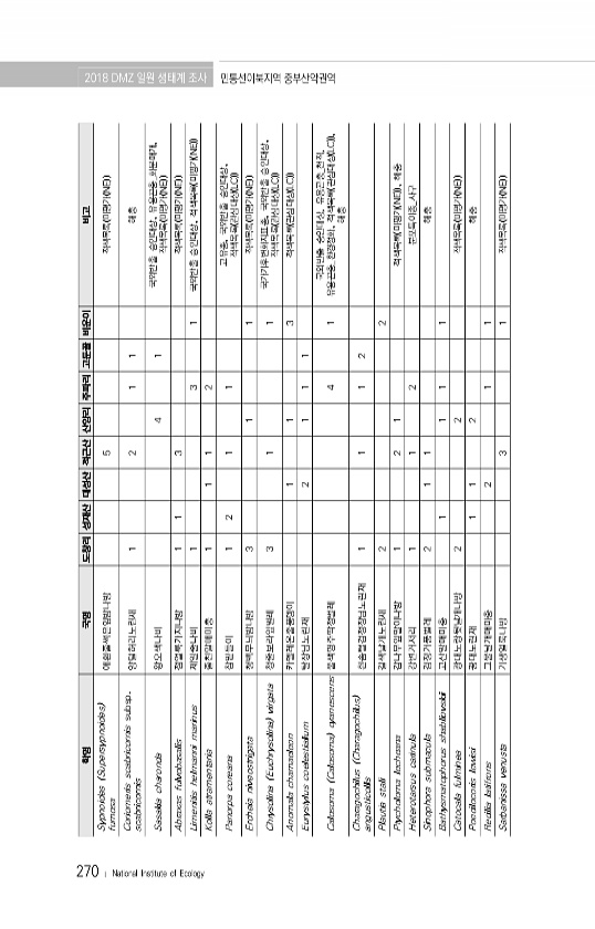 270 ? National Institute of Ecology 목 명 과 명 학 명 국 명 두타산 수병산 자병산 석병산 총 st1 st2 st3 st4 st5 st6 st7 st8 합계 특이사항 Coleoptera 딱정벌레목 Lagriidae 잎벌레붙이과 Lagria sinensis 중국잎벌레붙이 2 2 Coleoptera 딱정벌레목 Rutelidae 풍뎅이과 Callistethus plagiicollis 등노랑풍뎅이 2 2 1 1 4 2 1 13 국외반출승인대상 Coleoptera 딱정벌레목 Cerambycidae 하늘소과 Prionus insularis subsp. insularis 톱하늘소 1 2 1 4 국외반출승인대상, 적색목록 관심대상 LC Orthoptera 메뚜기목 Gryllotalpidae ...