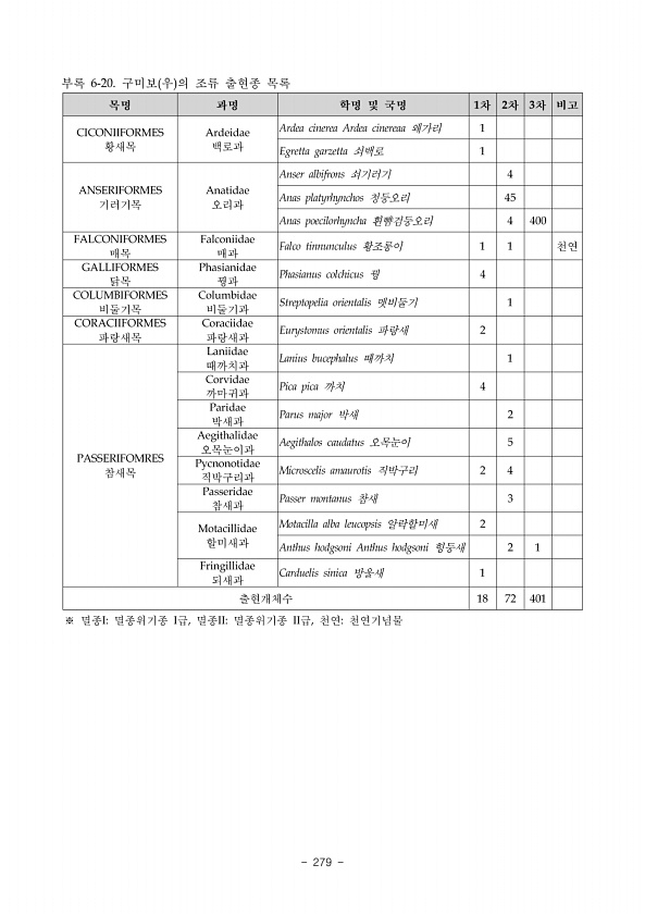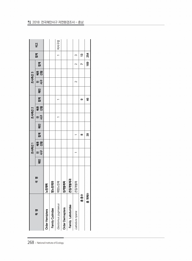 268 학 명 국 명 조사측선 1 조사측선 2 조사측선 3 합계 비고 해빈 전 사구 배후 산림 합계 해빈 사구 전 배후 산림 합계 해빈 사구 전 배후 산림 합계 Order Hemiptera 노린재목 Family Cydnidae 땅노린재과 Geotomus pygmaeus 애땅노린재 1 1 1 비사구성 Order Dermaptera 집게벌레목 Family Labiduridae 큰집게벌레과 Labidura riparia 큰집게벌레 1 1 2 2 3 총 종수 8 9 7 13 총 개체수 39 46 169254