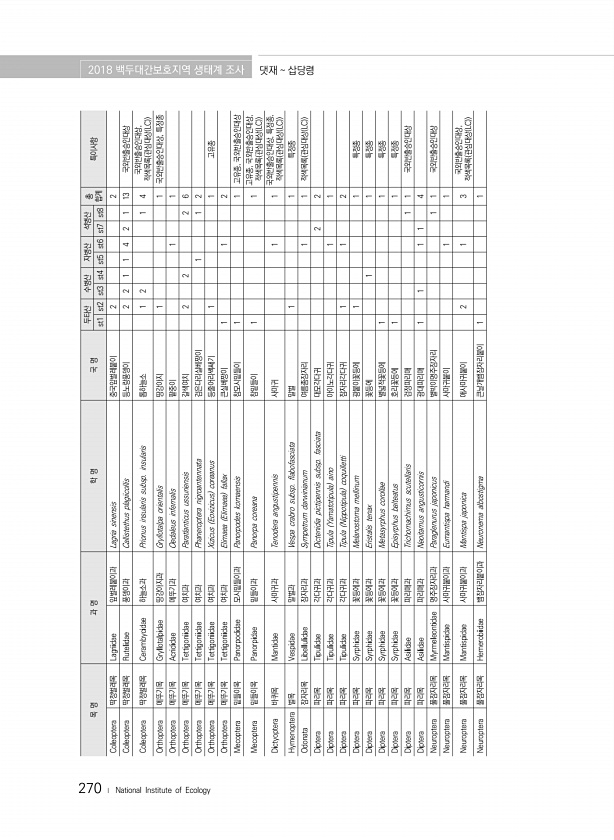 270 ? National Institute of Ecology 목 명 과 명 학 명 국 명 두타산 수병산 자병산 석병산 총 st1 st2 st3 st4 st5 st6 st7 st8 합계 특이사항 Coleoptera 딱정벌레목 Lagriidae 잎벌레붙이과 Lagria sinensis 중국잎벌레붙이 2 2 Coleoptera 딱정벌레목 Rutelidae 풍뎅이과 Callistethus plagiicollis 등노랑풍뎅이 2 2 1 1 4 2 1 13 국외반출승인대상 Coleoptera 딱정벌레목 Cerambycidae 하늘소과 Prionus insularis subsp. insularis 톱하늘소 1 2 1 4 국외반출승인대상, 적색목록 관심대상 LC Orthoptera 메뚜기목 Gryllotalpidae ...