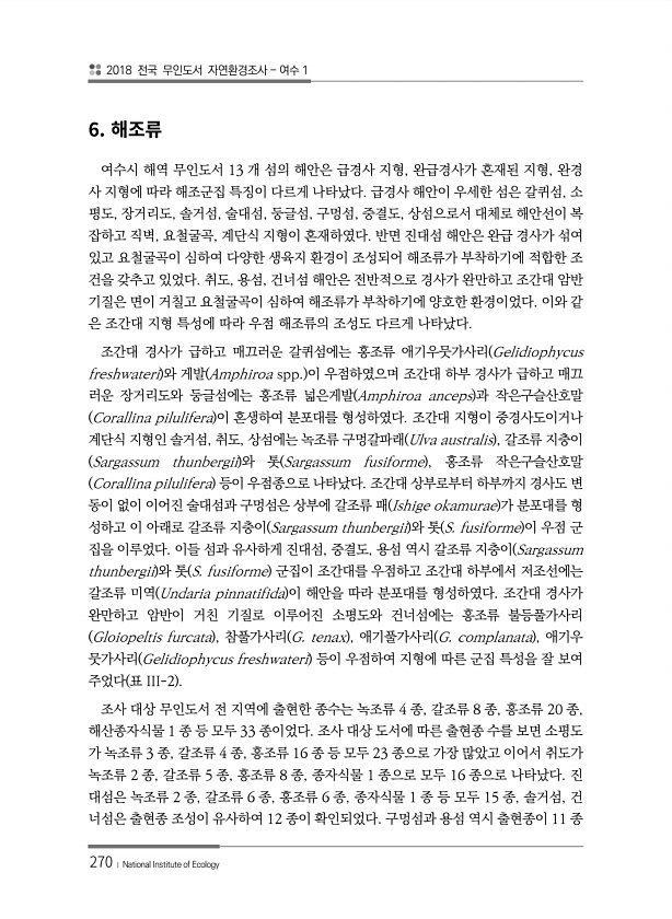2018 전국 무인도서 자연환경조사 여수 1 270 ? National Institute of Ecology 6. 여수시 해역 무인도서 13 개 섬의 해안은 급경사 지형, 완급경사가 혼재된 지형, 완경 사 지형에 따라 해조군집 특징이 다르게 나타났다. 급경사 해안이 우세한 섬은 갈퀴섬, 소 평도, 장거리도, 솔거섬, 술대섬, 둥글섬, 구멍섬, 중결도, 상섬으로서 대체로 해안선이 복 잡하고 직벽, 요철굴곡, 계단식 지형이 혼재하였다. 반면 진대섬 해안은 완급 경사가 섞여 있고 요철굴곡이 심하여 다양한 생육지 환경이 조성되어 해조류가 부착하기에 적합한 조 건을 갖추고 있었다. 취도, 용섬, 건너섬 해안은 전반적으로 경사가 완만하고 조간대 암반 기질은 면이 거칠고 요철굴곡이 심하여 해조류가 부착하기에 양호한 환경...
