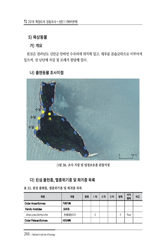 2018 특정도서 정밀조사 신안 1 북부권역 266 ? National Institute of Ecology 5 왼섬은 전라남도 신안군 암태면 수곡리에 위치해 있고, 대부분 곰솔군락으로 이루어져 있으며, 섬 남단에 자갈 및 모래가 발달해 있다. 그림 38. 조사 지점 및 법정보호종 관찰지점 , 학명 국명 문헌 1 차 2 차 3 차 합계 서식 형태 비고 Order Anseriformes 기러기목 Family Anatidae 오리과 Anas poecilorhyncha 흰뺨검둥오리 2 2 Res Order Pelecaniformes 사다새목 표 33. 왼섬 출현종, 멸종위기종 및 희귀종목록