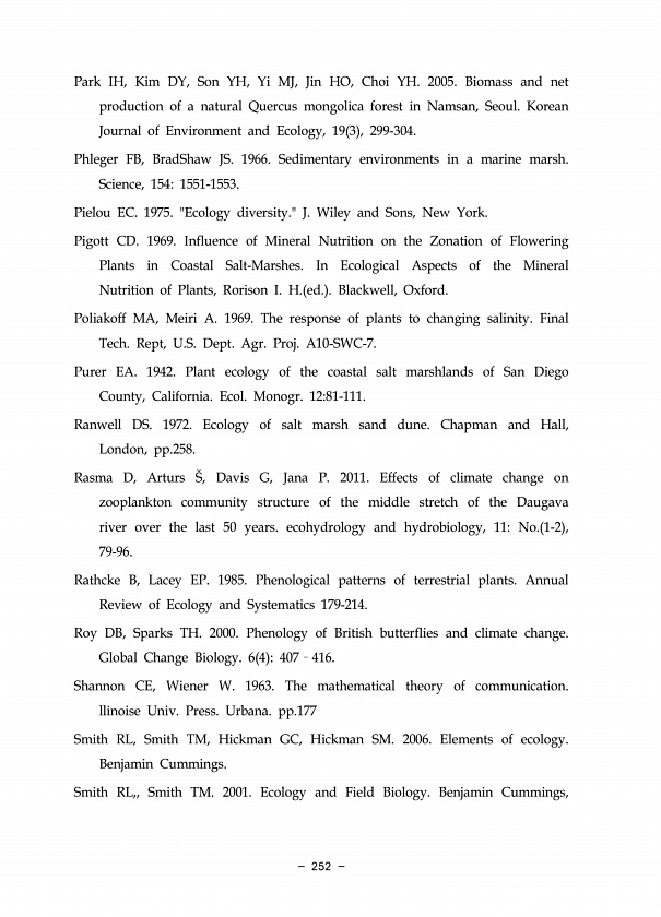 252 Park IH, Kim DY, Son YH, Yi MJ, Jin HO, Choi YH. 2005. Biomass and net production of a natural Quercus mongolica forest in Namsan, Seoul. Korean Journal of Environment and Ecology, 19 3 , 299-304. Phleger FB, BradShaw JS. 1966. Sedimentary environments in a marine marsh. Science, 1541551-1553. Pielou EC. 1975. Ecology diversity.J. Wiley and Sons, New York. Pigott CD. 1969. Influence of Mineral...
