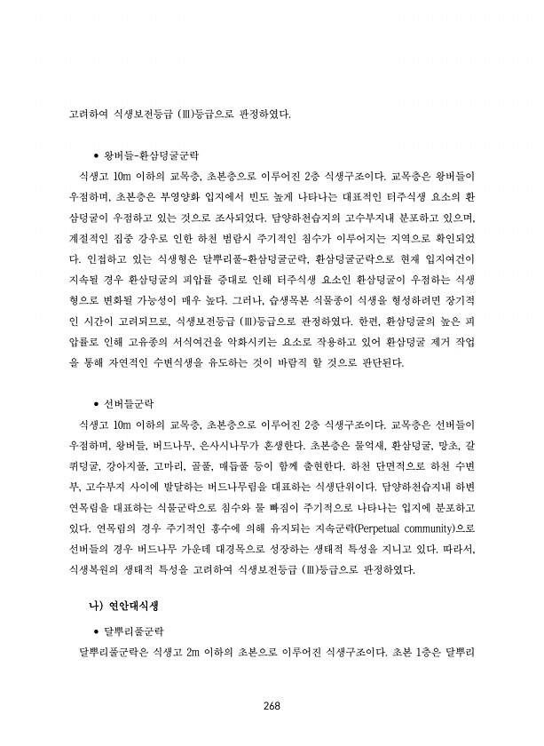 268 고려하여 식생보전등급 Ⅲ 등급으로 판정하였다. ? 왕버들-환삼덩굴군락 식생고 10m 이하의 교목층, 초본층으로 이루어진 2층 식생구조이다. 교목층은 왕버들이 우점하며, 초본층은 부영양화 입지에서 빈도 높게 나타나는 대표적인 터주식생 요소의 환 삼덩굴이 우점하고 있는 것으로 조사되었다. 담양하천습지의 고수부지내 분포하고 있으며, 계절적인 집중 강우로 인한 하천 범람시 주기적인 침수가 이루어지는 지역으로 확인되었 다. 인접하고 있는 식생형은 달뿌리풀-환삼덩굴군락, 환삼덩굴군락으로 현재 입지여건이 지속될 경우 환삼덩굴의 피압률 증대로 인해 터주식생 요소인 환삼덩굴이 우점하는 식생 형으로 변화될 가능성이 매우 높다. 그러나, 습생목본 식물종이 식생을 형성하려면 장기적 인 시간이 고려되므로, 식생보전등급 Ⅲ ...