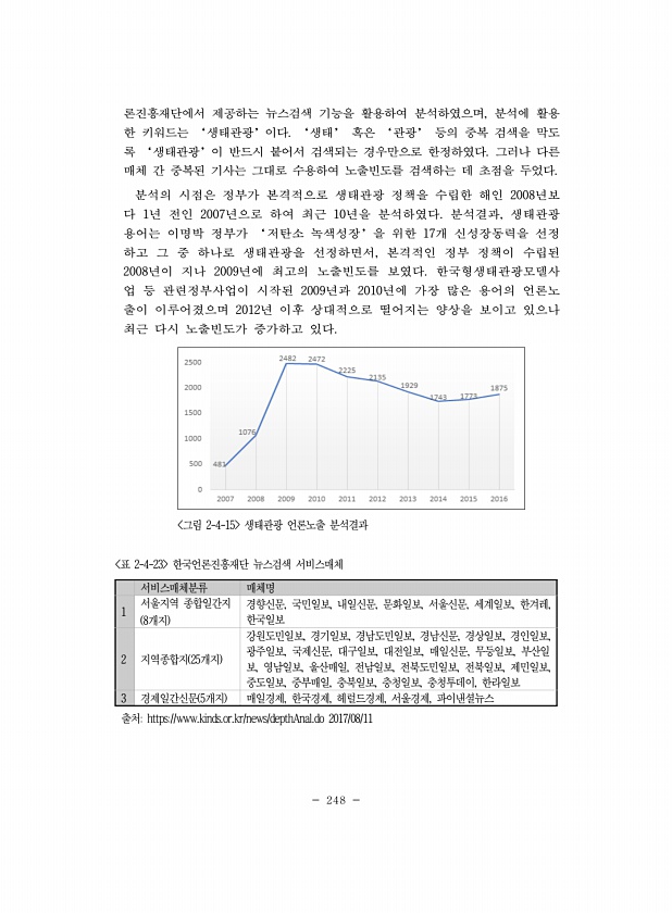 248 론진흥재단에서 제공하는 뉴스검색 기능을 활용하여 분석하였으며, 분석에 활용 한 키워드는 ‘생태관광’이다. ‘생태’ 혹은 ‘관광’ 등의 중복 검색을 막도 록 ‘생태관광’이 반드시 붙어서 검색되는 경우만으로 한정하였다. 그러나 다른 매체 간 중복된 기사는 그대로 수용하여 노출빈도를 검색하는 데 초점을 두었다. 분석의 시점은 정부가 본격적으로 생태관광 정책을 수립한 해인 2008년보 다 1년 전인 2007년으로 하여 최근 10년을 분석하였다. 분석결과, 생태관광 용어는 이명박 정부가 ‘저탄소 녹색성장’을 위한 17개 신성장동력을 선정 하고 그 중 하나로 생태관광을 선정하면서, 본격적인 정부 정책이 수립된 2008년이 지나 2009년에 최고의 노출빈도를 보였다. 한국형생태관광모델사 업 등 관련정부사업이 시작...