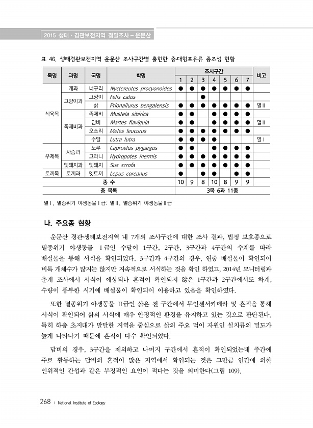 2015 생태·경관보전지역 정밀조사 운문산 268 ? National Institute of Ecology 표 46. 생태경관보전지역 운문산 조사구간별 출현한 중?대형포유류 종조성 현황 목명 과명 국명 학명 조사구간 비고 1 2 3 4 5 6 7 식육목 개과 너구리 Nyctereutes procyonoides ● ● ● ● ● ● ● 고양이과 고양이 Felis catus ● 삵 Prionailurus bengalensis ● ● ● ● ● ● ● 멸Ⅱ 족제비과 족제비 Mustela sibirica ● ● ● ● ● ● 담비 Martes flavigula ● ● ● ● ● ● 멸Ⅱ 오소리 Meles leucurus ● ● ● ● ● ● ● 수달 Lutra lutra ● ● ● ● 멸Ⅰ 우제목 사슴과 노루 Ca...