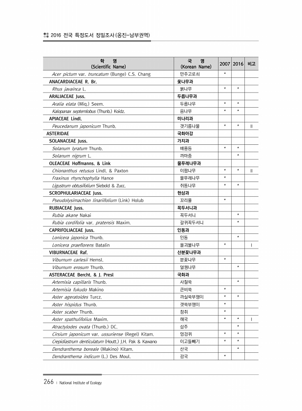 2016 전국 특정도서 정밀조사 옹진-남부권역 266 ? National Institute of Ecology 학 명 Scientific Name 국 명 Korean Name 2007 2016 비고 Acer pictum var. truncatum Bunge C.S. Chang 만주고로쇠 * ANACARDIACEAE R. Br. 옻나무과 Rhus javainca L. 붉나무 * * ARALIACEAE Juss. 두릅나무과 Aralia elata Miq. Seem. 두릅나무 * * Kalopanax septemlobus Thunb. Koidz. 음나무 * * APIACEAE Lindl. 미나리과 Peucedanum japonicum Thunb. 갯기름나물 * * Ⅱ ASTERIDAE 국화아강 SOLANACEAE...