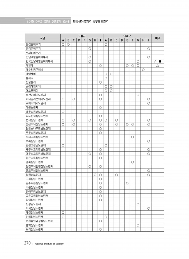 2015 DMZ 일원 생태계 조사 민통선이북지역 동부해안권역 270 ? National Institute of Ecology 국명 고성군 인제군 비고 A B C D F G H I A B C D E F G H I 등검은메뚜기 ○ ○ ○ 끝검은메뚜기 ○ ○ 두꺼비메뚜기 ○ 민날개밑들이메뚜기 ○ ○ 한국민날개밑들이메뚜기 ○ ○ ☆, ■ 대벌레 ○ ○ ○ ○ △ 메추리장구애비 ○ 게아재비 ○ ○ 물자라 ○ 방물벌레 ○ 송장헤엄치게 ○ ○ 애소금쟁이 ○ ○ 빨간긴쐐기노린재 ○ ○ 미니날개큰쐐기노린재 ○ ○ ○ ○ 로이터쐐기노린재 ○ 애꽃노린재 ○ 네무늬장님노린재 ○ 나도변색장님노린재 ○ 변색장님노린재 ○ ○ ○ ○ ○ ○ ○ 설상무늬장님노린재 ○ ○ ○ ○ ○ ○ ○ 닮은소나무장님노린재 ○ 두무늬장님노린재 ○ 무늬고...