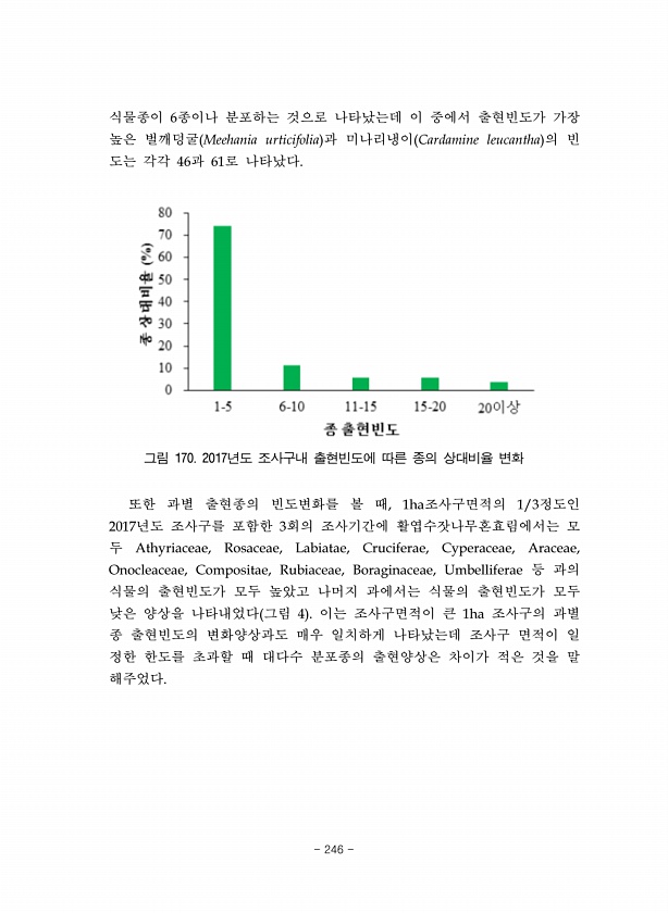 식물종이 6종이나 분포하는 것으로 나타났는데 이 중에서 출현빈도가 가장 높은 벌깨덩굴 Meehania urticifolia 과 미나리냉이 Cardamine leucantha 의 빈 도는 각각 46과 61로 나타났다. 그림 170. 2017년도 조사구내 출현빈도에 따른 종의 상대비율 변화 또한 과별 출현종의 빈도변화를 볼 때, 1ha조사구면적의 1/3정도인 2017년도 조사구를 포함한 3회의 조사기간에 활엽수잣나무혼효림에서는 모 두 Athyriaceae, Rosaceae, Labiatae, Cruciferae, Cyperaceae, Araceae, Onocleaceae, Compositae, Rubiaceae, Boraginaceae, Umbelliferae 등 과의 식물의 출현빈도가 모두 높았고 나머지 과에...