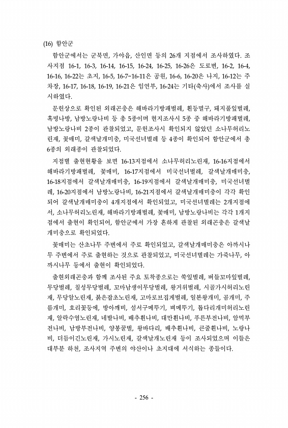 16 함안군 함안군에서는 군북면, 가야읍, 산인면 등의 26개 지점에서 조사하였다. 조 사지점 16-1, 16-3, 16-14, 16-15, 16-24, 16-25, 16-26은 도로변, 16-2, 16-4, 16-16, 16-22는 초지, 16-5, 16-716-11은 공원, 16-6, 16-20은 나지, 16-12는 주 차장, 16-17, 16-18, 16-19, 16-21은 임연부, 16-24는 기타 축사 에서 조사를 실 시하였다. 문헌상으로 확인된 외래곤충은 해바라기방패벌레, 흰등멸구, 돼지풀잎벌레, 혹명나방, 남방노랑나비 등 총 5종이며 현지조사시 5종 중 해바라기방패벌레, 남방노랑나비 2종이 관찰되었고, 문헌조사시 확인되지 않았던 소나무허리노 린재, 꽃매미, 갈색날개미충, 미국선녀벌레 등 4종이 ...