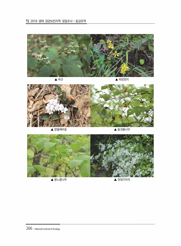 2018 생태·경관보전지역 정밀조사 동강유역 266 ? National Institute of Ecology ▲ 속단 ▲ 쑥방망이 ▲ 영월제비꽃 ▲ 올괴불나무 ▲ 왕느릅나무 ▲외대으아리