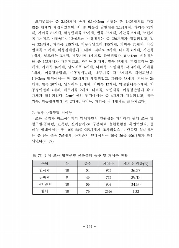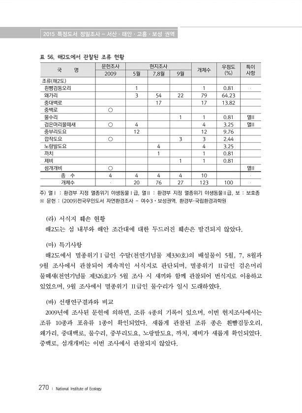 2015 특정도서 정밀조사 서산·태안·고흥·보성 권역 270 ? National Institute of Ecology 표 56. 해2도에서 관찰된 조류 현황 국 명 문헌조사 현지조사 개체수 우점도 % 특이 2009 5월 7,8월 9월 사항 조류 해2도 흰뺨검둥오리 1 1 0.81 왜가리 3 54 22 79 64.23 중대백로 17 17 13.82 중백로 ○ 물수리 1 1 0.81 멸II 검은머리물떼새 ○ 4 4 3.25 멸II 중부리도요 12 12 9.76 깝작도요 ○ 3 3 2.44 노랑발도요 4 4 3.25 까치 1 1 0.81 제비 1 1 0.81 섬개개비 ○ 멸II 종 수 4 4 4 4 10 개체수 20 76 27 123 100 주 멸Ⅰ 환경부 지정 멸종위기 야생동물Ⅰ급, 멸Ⅱ 환경부 지정...