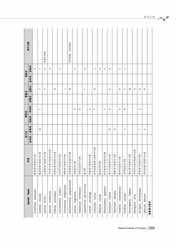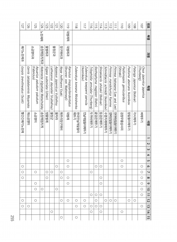 255 번호 목명 과명 학명 국명 1 2 3 4 5 6 7 8 9 10 11 12 13 14 15 107 Oxya japonica japonica Thunberg 벼메뚜기 ○ ○ ○ ○ ○ ○ ○ 108 Patanga japonica Bolivar 각시메뚜기 ○ 109 Podisma aberrans Ikonnikov 참밑들이메뚜기 ○ 110 Podismopsis genicularibus Shiraki 검정무릎삽사리 ○ ○ ○ 111 Primnoa halrasana Lee and Lee 한라북방밑들이메뚜기 ○ 112 Primnoa mandshurica Ramme 참북방밑들이메뚜기 ○ 113 Schmidtiacris schmidti Ikonnikov 수염치레애메뚜기 ○ 114 Shirakiacris shirak...