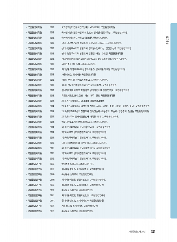 ? 국립환경과학원 2013. 국가장기생태연구사업 3단계 ⅠⅣ 보고서. 국립환경과학원. ? 국립환경과학원 2013. 국가장기생태연구사업 백서한반도 장기생태연구 10년사. 국립환경과학원. ? 국립환경과학원 2013. 국가장기생태연구사업 조사방법론. 국립환경과학원. ? 국립환경과학원 2013. 생태 · 경관보전지역 정밀조사동강유역 · 소황사구. 국립환경과학원. ? 국립환경과학원 2013. 생태 · 경관우수지역 발굴조사명덕봉 · 민주지산 · 섬진강 상류. 국립환경과학원. ? 국립환경과학원 2013. 생태 · 경관우수지역 발굴조사상원산 · 매봉 · 수도산. 국립환경과학원. ? 국립환경과학원 2013. 생태계위해성이 높은 외래종의 정밀조사 및 관리방안 Ⅷ 국립환경과학원. ? 국립환경과학원 2013. 외래곤충과 먹이식물...