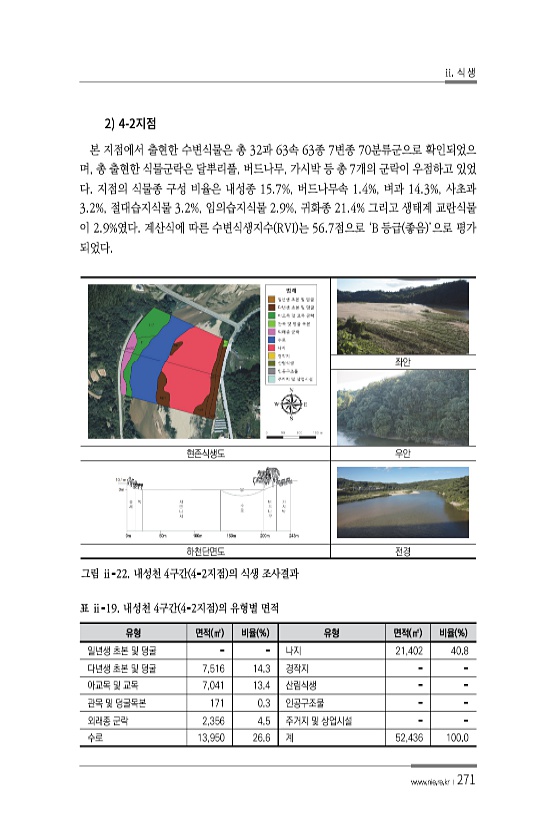 ii. 식 생 www.nie.re.kr ?271 2 4- 본 지점에서 출현한 수변식물은 총 32과 63속 63종 7변종 70분류군으로 확인되었으 며, 총 출현한 식물군락은 달뿌리풀, 버드나무, 가시박 등 총 7개의 군락이 우점하고 있었 다. 지점의 식물종 구성 비율은 내성종 15.7%, 버드나무속 1.4%, 벼과 14.3%, 사초과 3.2%, 절대습지식물 3.2%, 임의습지식물 2.9%, 귀화종 21.4% 그리고 생태계 교란식물 이 2.9%였다. 계산식에 따른 수변식생지수 RVI 는 56.7점으로 ‘B 등급 좋음 ’으로 평가 되었다. 좌안 현존식생도 우안 하천단면도 전경 그림 ⅱ-22. 내성천 4구간 4-2지점 의 식생 조사결과 유형 면적 ㎡ 비율 % 유형 면적 ㎡ 비율 % 일년생 초본 및 덩굴 나지 21,...