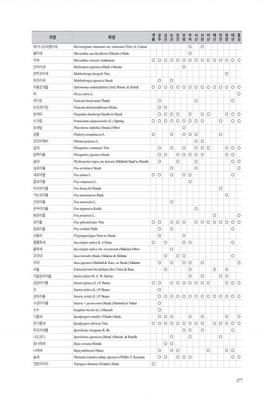 277 애기나도바랭이새 Microstegium vimineum var. vimineum Trin. A. Camus ○ ○ 물억새 Miscanthus sacchariforus Maxim. Hack. ○ 억새 Miscanthus sinensis Andersson ○ ○ ○ ○ ○ ○ ○ ○ ○ ○ ○ ○ ○ ○ ○ 진퍼리새 Moliniopsis japonica Hack. Hayata ○ 큰쥐꼬리새 Muhlenbergia huegelii Trin. ○ 쥐꼬리새 Muhlenbergia japonica Steud. ○ ○ 주름조개풀 Oplismenus undulatifolius Ard. Roem. & Schult. ○ ○ ○ ○ ○ ○ ○ ○ ○ ○ ○ ○ ○ ○ ○ 벼 Oryza sativa L. ○ 개기장 Pan...