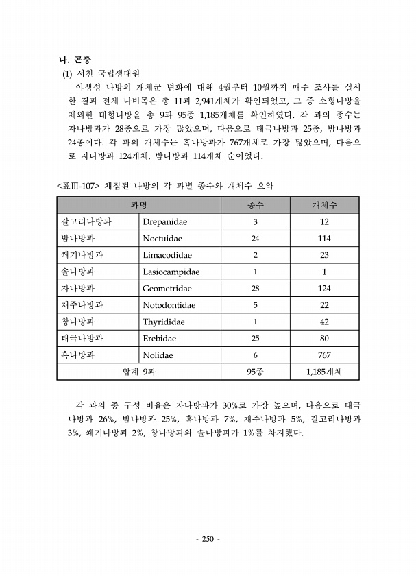 250 나. 곤충 1 서천 국립생태원 야생성 나방의 개체군 변화에 대해 4월부터 10월까지 매주 조사를 실시 한 결과 전체 나비목은 총 11과 2,941개체가 확인되었고, 그 중 소형나방을 제외한 대형나방을 총 9과 95종 1,185개체를 확인하였다. 각 과의 종수는 자나방과가 28종으로 가장 많았으며, 다음으로 태극나방과 25종, 밤나방과 24종이다. 각 과의 개체수는 혹나방과가 767개체로 가장 많았으며, 다음으 로 자나방과 124개체, 밤나방과 114개체 순이었다. 과명 종수 개체수 갈고리나방과 Drepanidae 3 12 밤나방과 Noctuidae 24 114 쐐기나방과 Limacodidae 2 23 솔나방과 Lasiocampidae 1 1 자나방과 Geometridae 28 124 재주나방과 Not...