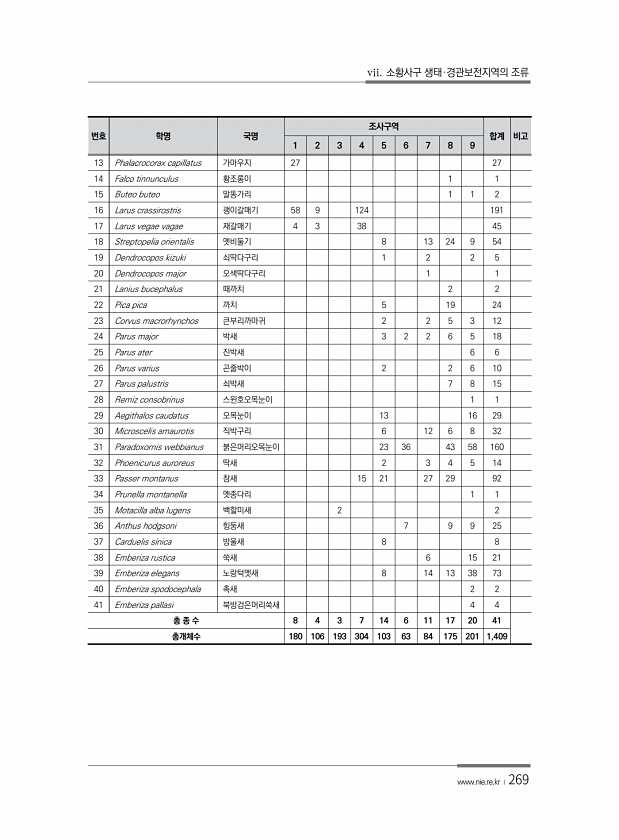 vii. 소황사구 생태·경관보전지역의 조류 www.nie.re.kr ?269 번호 학명 국명 조사구역 합계 비고 1 2 3 4 5 6 7 8 9 13 Phalacrocorax capillatus 가마우지 27 27 14 Falco tinnunculus 황조롱이 1 1 15 Buteo buteo 말똥가리 1 1 2 16 Larus crassirostris 괭이갈매기 58 9 124 191 17 Larus vegae vagae 재갈매기 4 3 38 45 18 Streptopelia orientalis 멧비둘기 8 13 24 9 54 19 Dendrocopos kizuki 쇠딱다구리 1 2 2 5 20 Dendrocopos major 오색딱다구리 1 1 21 Lanius bucephalus 때까치 2 2 22 P...
