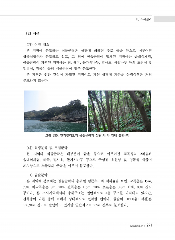 Ⅱ. 조사결과 www.nie.re.kr ? 271 2 식생 가 식생 개요 본 지역에 분포하는 식물군락은 상관에 의하면 주로 곰솔 등으로 이루어진 상록침엽수가 분포하고 있고, 그 외에 곰솔군락이 벌채된 지역에는 솜대식재림, 곰솔군락이 파괴된 지역에는 칡, 해국, 돌가시나무, 밀사초, 사철나무 등의 초원성 및 덩굴성, 저목성 등의 식물군락이 일부 분포한다. 본 지역은 인간 간섭이 가해진 지역이고 자연 상태에 가까운 삼림식생은 거의 분포하지 않는다. 그림 295. 안거칠리도의 곰솔군락의 상관 좌 과 임내 유형 우 나 식생분석 및 우점군락 본 지역의 식물군락은 대부분이 곰솔 등으로 이루어진 교목성의 2차림과 솜대식재림, 해국, 밀사초, 돌가시나무 등으로 구성된 초원성 및 덩굴성 식물이 패치상으로 소규모의 군락을 이...