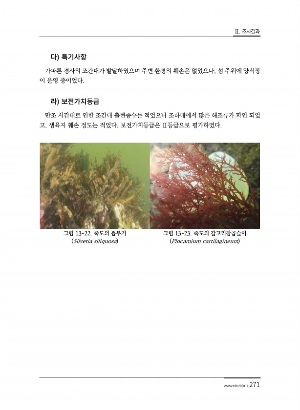 II. 조사결과 www.nie.re.kr ?271 가파른 경사의 조간대가 발달하였으며 주변 환경의 훼손은 없었으나, 섬 주위에 양식장 이 운영 중이었다. 만조 시간대로 인한 조간대 출현종수는 적었으나 조하대에서 많은 해조류가 확인 되었 고, 생육지 훼손 정도는 적었다. 보전가치등급은 Ⅱ등급으로 평가하였다. 그림 13-22. 죽도의 뜸부기 Silvetia siliquosa 그림 13-23. 죽도의 갈고리참곱슬이 Plocamium cartilagineum