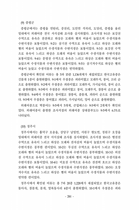 261 9 증평군 증평군에서는 증평읍 연탄리, 중천리, 도안면 석곡리, 도당리, 증평읍 율리 일대에서 외래어종 전국 서식실태 조사를 실시하였다. 조사지점 9-1은 보강천 수역으로 유속은 잔잔하고 하상은 모래와 뻘의 비율이 높았으며 수생식물과 수변식생은 보통이었다. 9-2는 삼기천 수역으로 유속이 느리고 하상은 모래와 뻘의 비율이 높았으며 수생식물과 수변식생은 보통이었다. 9-3은 보강천 수역 으로 유속이 느리고 하상은 모래의 비율이 높았으며 수생식물과 수변식생은 보통이었다. 9-4는 문방천 수역으로 유속은 느리고 하상은 모래와 뻘의 비율이 높았으며 수생식물과 수변식생은 보통이었다. 9-5는 삼기저수지로 하상은 뻘의 비율이 높았고 수생식물과 수변식생은 빈약하였다. 증평군에서 확인된 어류는 총 5과 15종 1,...