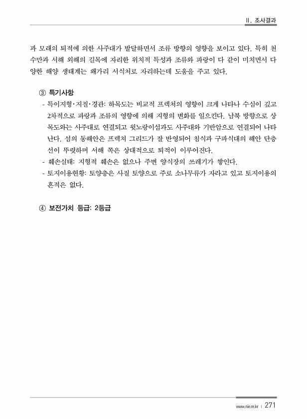 Ⅱ. 조사결과 www.nie.re.kr ? 271 과 모래의 퇴적에 의한 사주대가 발달하면서 조류 방향의 영향을 보이고 있다. 특히 천 수만과 서해 외해의 길목에 자리한 위치적 특성과 조류와 파랑이 다 같이 미치면서 다 양한 해양 생태계는 왜가리 서식처로 자리하는데 도움을 주고 있다. ③ 특기사항 특이지형?지질?경관하목도는 비교적 프렉쳐의 영향이 크게 나타나 수심이 깊고 2차적으로 파랑과 조류의 영향에 의해 지형의 변화를 일으킨다. 남북 방향으로 상 목도와는 사주대로 연결되고 윗노랑이섬과도 사주대와 기반암으로 연결되어 나타 난다. 섬의 동해안은 프렉쳐 그리드가 잘 반영되어 침식과 구파식대의 해안 단층 선이 뚜렷하며 서해 쪽은 상대적으로 퇴적이 이루어진다. 훼손실태지형적 훼손은 없으나 주변 양식장의 쓰레기가 ...