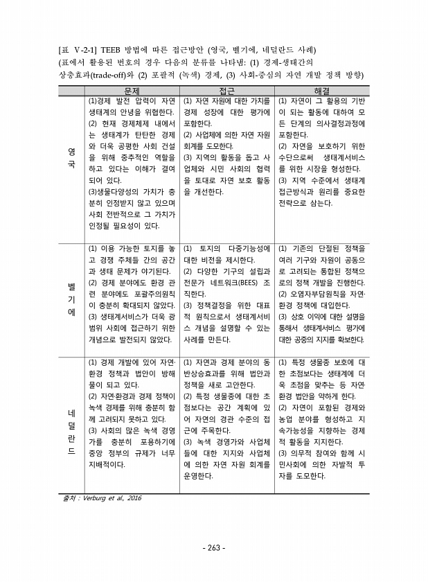 문제 접근 해결 영 국 1 경제 발전 압력이 자연 생태계의 안녕을 위협한다. 2 현재 경제체제 내에서 는 생태계가 탄탄한 경제 와 더욱 공평한 사회 건설 을 위해 중추적인 역할을 하고 있다는 이해가 결여 되어 있다. 3 생물다양성의 가치가 충 분히 인정받지 않고 있으며 사회 전반적으로 그 가치가 인정될 필요성이 있다. 1 자연 자원에 대한 가치를 경제 성장에 대한 평가에 포함한다. 2 사업체에 의한 자연 자원 회계를 도모한다. 3 지역의 활동을 돕고 사 업체와 시민 사회의 협력 을 토대로 자연 보호 활동 을 개선한다. 1 자연이 그 활용의 기반 이 되는 활동에 대하여 모 든 단계의 의사결정과정에 포함한다. 2 자연을 보호하기 위한 수단으로써 생태계서비스 를 위한 시장을 형성한다. 3 지역 수준에서 생태계 접...