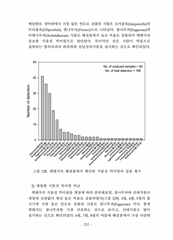 232 예상된다. 장미과에서 가장 많은 빈도로 검출된 식물은 오이풀속 Sanguisorba 과 터리풀속 Filipendula , 벚나무속 Prunus 으로 나타났다. 참나무과 Fagaceae 와 다래나무과 Actinidiaceae 식물도 배설물에서 높은 비율로 검출되어 멧돼지의 중요한 식물성 먹이원으로 판단된다. 특이적인 것은 사람이 약용으로 섭취하는 범의귀과의 바위취와 천남성과식물을 섭식하는 것으로 확인되었다. No. of analyzed samples = 80 No. of total detection = 188 Rosaceae 장미과 Bryophyte 선태식물 Fagaceae 참나무과 Actinidiaceae 다래나무과 Araceae 천남성과 Pinaceae 소나무과 Violaceae 제비꽃과 Cyper...