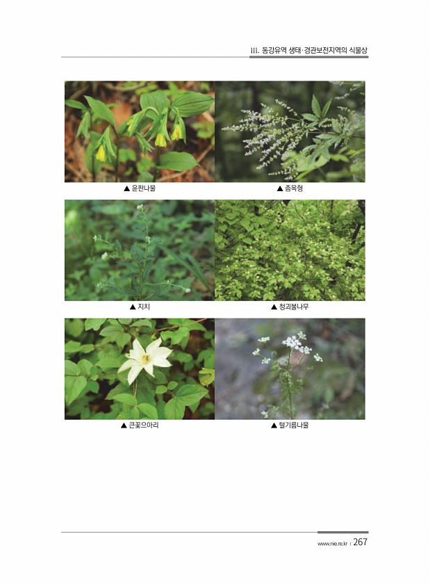 iii. 동강유역 생태·경관보전지역의 식물상 www.nie.re.kr ?267 ▲ 윤판나물 ▲ 좀목형 ▲ 지치 ▲ 청괴불나무 ▲ 큰꽃으아리 ▲털기름나물