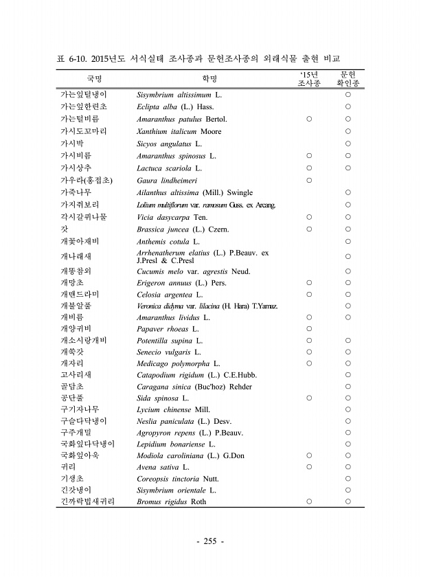 255 국명 학명 ‘15년 조사종 문헌 확인종 가는잎털냉이 Sisymbrium altissimum L. ○ 가는잎한련초 Eclipta alba L. Hass. ○ 가는털비름 Amaranthus patulus Bertol. ○ ○ 가시도꼬마리 Xanthium italicum Moore ○ 가시박 Sicyos angulatus L. ○ 가시비름 Amaranthus spinosus L. ○ ○ 가시상추 Lactuca scariola L. ○ ○ 가우라 홍접초 Gaura lindheimeri ○ 가죽나무 Ailanthus altissima Mill. Swingle ○ 가지쥐보리 Lolium multiflorum var. ramosum Guss. ex Arcang. ○ 각시갈퀴나물 Vicia dasycarpa Ten...