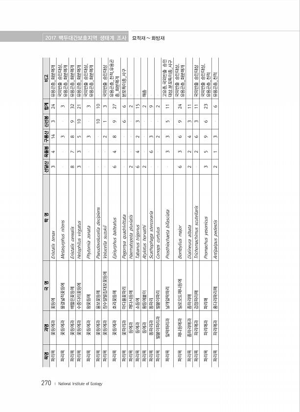 270 목명 과명 국 명 학 명 선달산 옥돌봉 구룡산 신선봉 합계 비고 파리목 꽃등에과 꽃등에 Eristalis tenax 3 4 14 3 24 유용곤충_화분매개 파리목 꽃등에과 물결넓적꽃등에 Metasyrphus nitens 3 3 국외반출 승인대상, 유용곤충_화분매개 파리목 꽃등에과 배짧은꽃등에 Eristalis cerealis 8 7 8 9 32 유용곤충_화분매개 파리목 꽃등에과 수중다리꽃등에 Helophilus virgatus 3 3 5 10 21 유용곤충_화분매개 파리목 꽃등에과 왕꽃등에 Phytomia zonata 3 3 국외반출 승인대상, 유용곤충_화분매개 파리목 꽃등에과 울보꽃등에 Pseudovolucella decipiens 10 10 파리목 꽃등에과 장수...