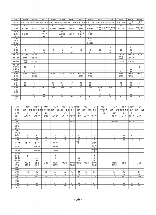 구분 매탄55 매탄56 매탄57 매탄58 매탄59 매탄60 매탄61 매탄62 매탄63 매탄64 매탄65 매탄66 매탄67 중분류 조경수 활엽 조경수 침엽 조경수 활엽 조경수 활엽 조경수 활엽 조경수 활엽 조경수 침엽 조경수 활엽 조경수 침엽 조경수 침엽 조경수 활엽 조경수 침엽 조경수 침엽 소분류 B17 B1 B17 B7 B17 B17 B4 B17 B2 B2 B7 B1 B3 교목1 느티나무 소나무 이팝나무 느티나무 단풍나무 백목련 전나무 단풍나무 스트로브잣나 무 스트로브잣나 무 느티나무 소나무 메타세콰이 어 교목1% 40 60 80 30 교목2 이팝나무 섬잣나무 느티나무 느티나무 이팝나무 백목련 교목2% 40 40 20 30 교목3 산수유 교목3% 20 교목4 섬잣나무 교목4% 20 교목H 6 9 3 6 5...