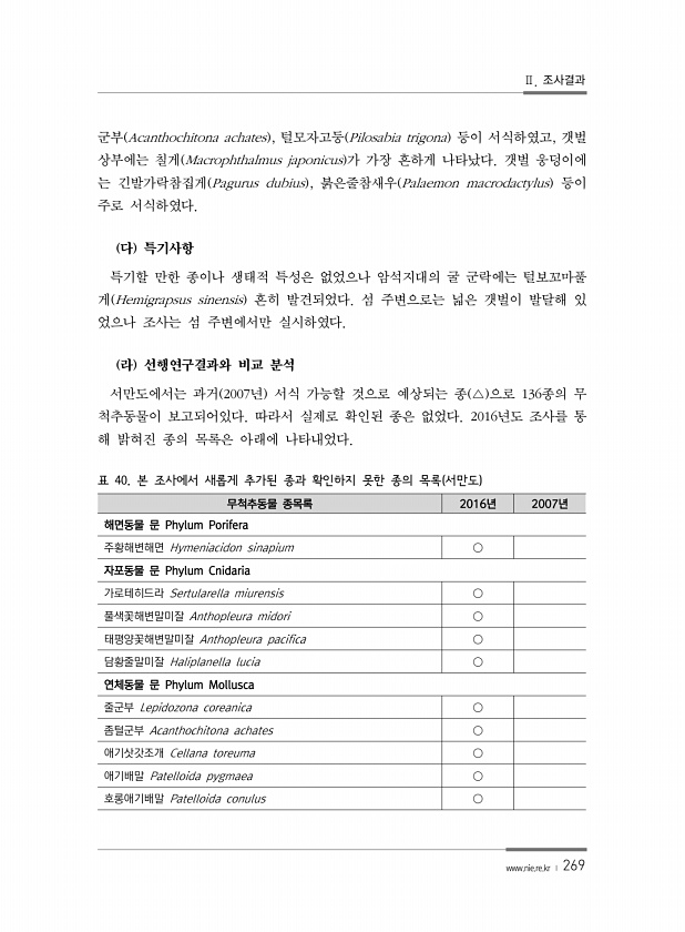 Ⅱ. 조사결과 www.nie.re.kr ? 269 무척추동물 종목록 2016년 2007년 해면동물 문 Phylum Porifera 주황해변해면 Hymeniacidon sinapium ○ 자포동물 문 Phylum Cnidaria 가로테히드라 Sertularella miurensis ○ 풀색꽃해변말미잘 Anthopleura midori ○ 태평양꽃해변말미잘 Anthopleura pacifica ○ 담황줄말미잘 Haliplanella lucia ○ 연체동물 문 Phylum Mollusca 줄군부 Lepidozona coreanica ○ 좀털군부 Acanthochitona achates ○ 애기삿갓조개 Cellana toreuma ○ 애기배말 Patelloida pygmaea ○ 호롱애기배말 Patelloida c...