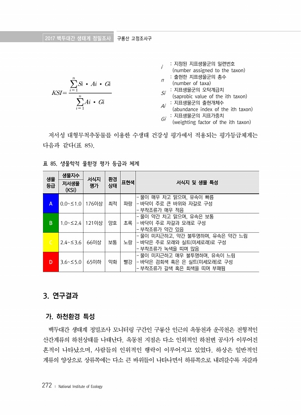 2017 백두대간 생태계 정밀조사 구룡산 고정조사구 272 ? National Institute of Ecology ?? ??? ?? ????? i 지정된 지표생물군의 일련번호 number assigned to the taxon n 출현한 지표생물군의 총수 number of taxa Si 지표생물군의 오탁계급치 saprobic value of the ith taxon Ai 지표생물군의 출현개체수 abundance index of the ith taxon Gi 지표생물군의 지표가중치 weighting factor of the ith taxon 저서성 대형무척추동물를 이용한 수생태 건강성 평가에서 적용되는 평가등급체계는 다음과 같다 표 85 생물 등급 생물지수 서식지 평가 환경 ...